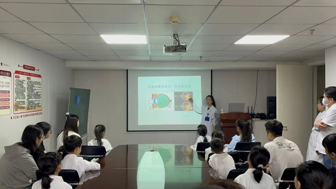 科普小課堂上,院長王曉鵬與視光主任何嫦娟從眼睛的構造、近視形成的原因、如何正確護眼三個方面多個內容延展開來,以生動有趣、通俗易懂的教學方法為小朋友們科普了愛眼護眼的重要性,樹立愛眼護眼意識。