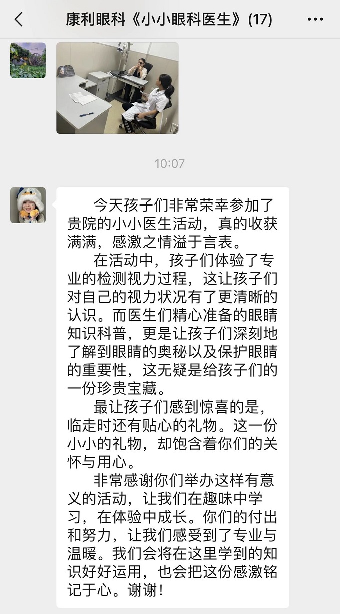 隨行家長對此次活動贊不絕口,更有家長結束后在群里發表自己的感想。我們相信,提高家醫校攜手互相配合,共同為兒童青少年視力保駕護航,定能為孩子們的眼健康提供更加堅實的基礎。
